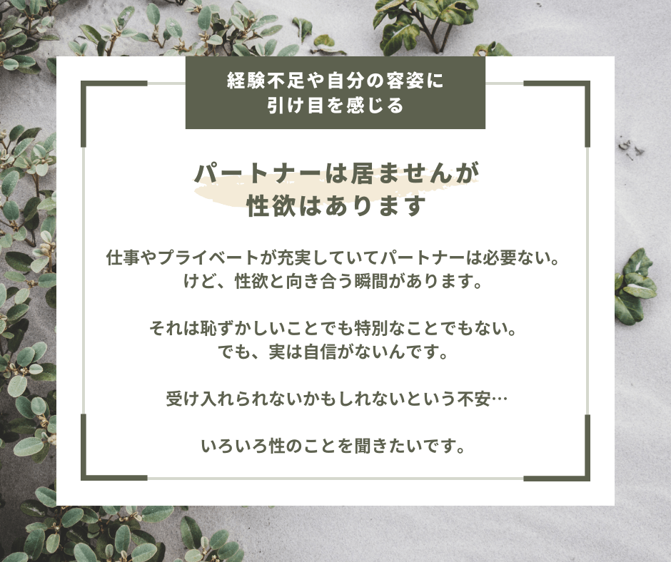 はい。性の不安や欲求、将来への悩みなども含めて整理できます。自分を責めずに扱える形に整えていきます。